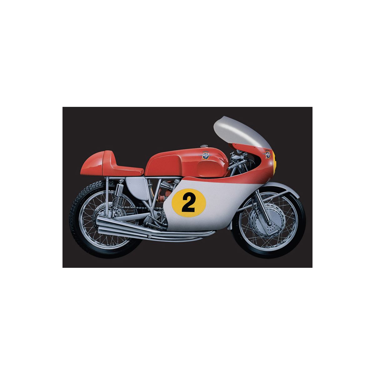 A készlet tartalma: MV AGUSTA 500cc 4 cylinders 1964 makett, és a hozzá tartozó matrica készlet.
