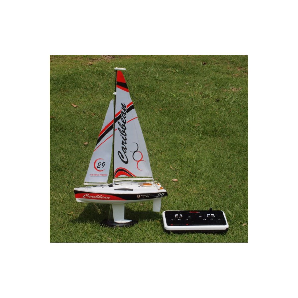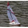 2,4 Ghz-es távirányítóval, valamint 2 db 9g-os szervóval, a vitorlamozgatáshoz és a kormányzáshoz.