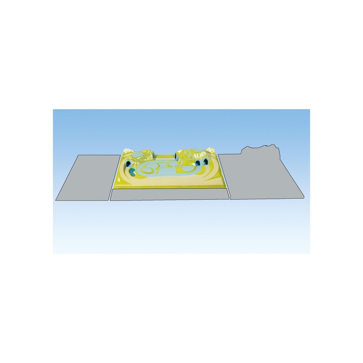 A terepeasztal a síneket, épületeket, figurákat, szóróanyagot, egyéb tereptárgyakat nem tartalmazza, csak az alaplapot domborzattal, ill. a hidat!